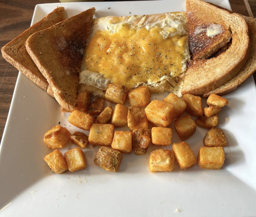 Breakfast came and was long on potatoes and devoid of tomatoes.