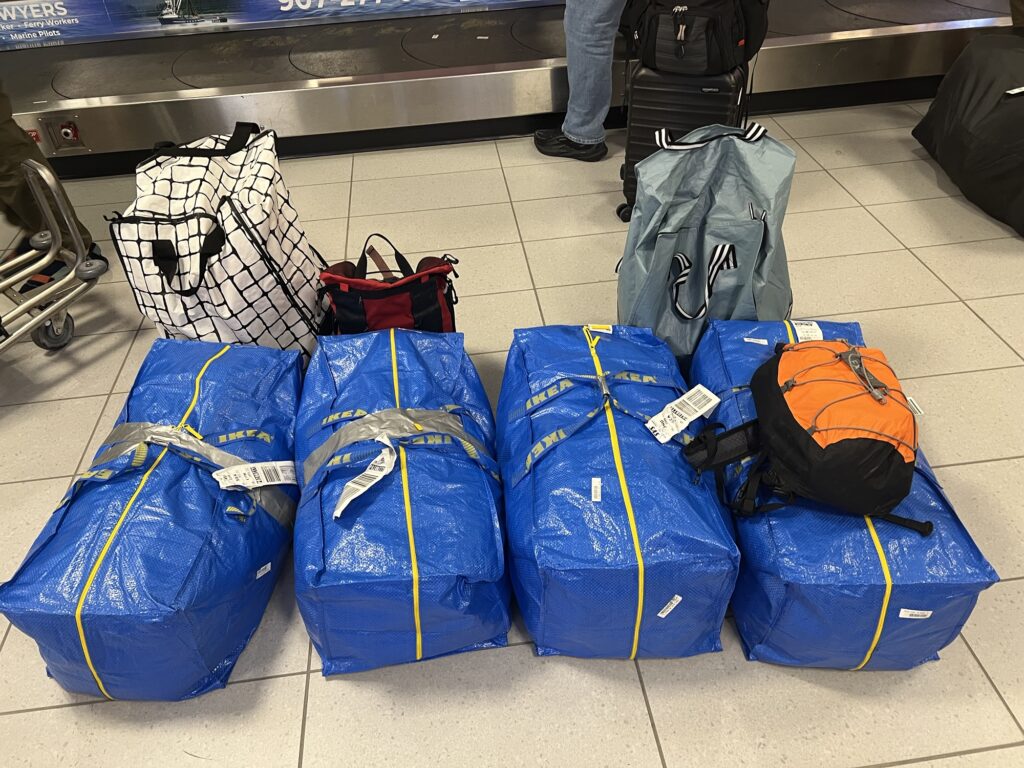 One of Erling’s IKEA bags was torn, but as a precaution the IKEA bags were packed in “double Kamprad” fashion. That is two bags, one outside the other. And the inner bag was undamaged, so no trail of dry sacks from Seattle to Juneau
