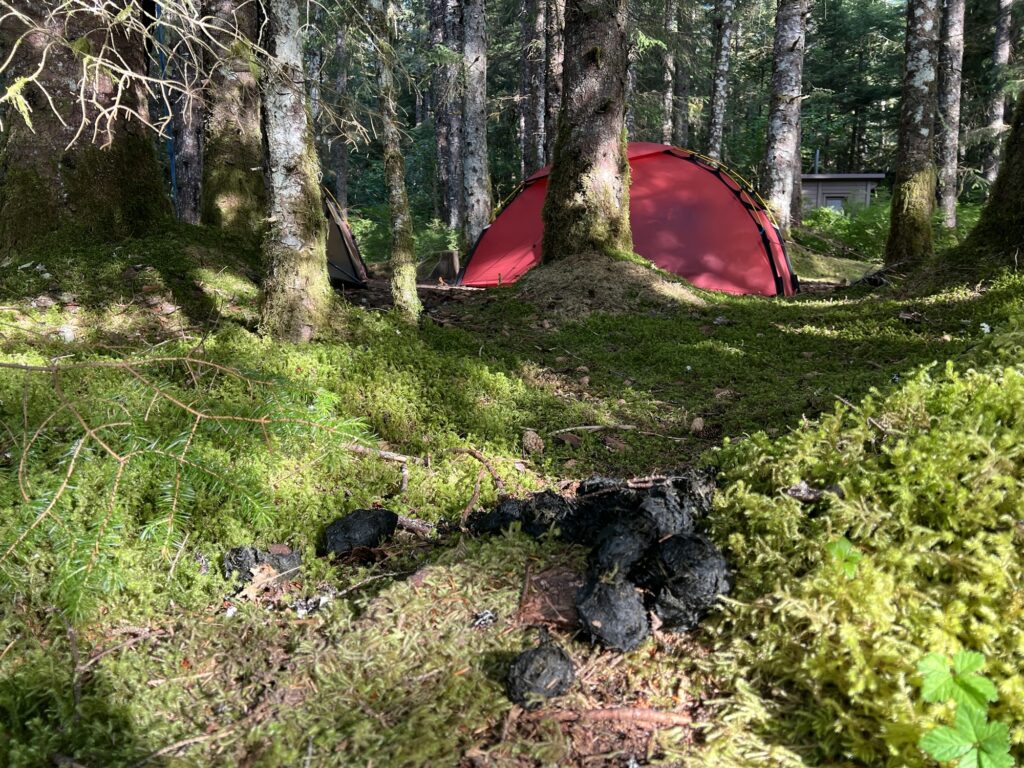 We got the tents up. We chose the site with the freshest bear shit, it seems they shit a different place every night, so this site is hopefully “spoken for” -or shall we say “shat for”- for the two nights we stay here.