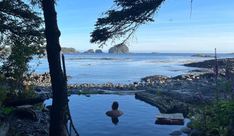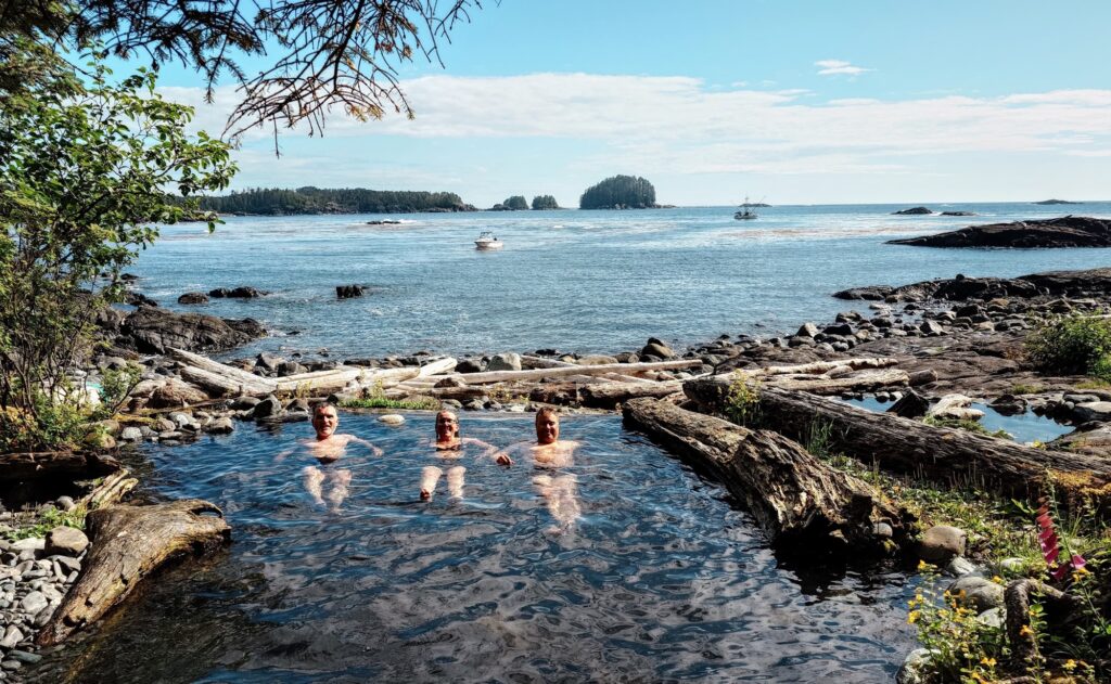 On arriving at the hot springs we were greeted by a three generation plus two dogs family outing and a salmon fisherman, both parties based in Elfin Cove for the summer. That is where we plan to be in two days time.